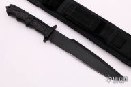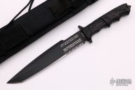 Maker statement: The 911 designation isn't for the emergency call, it's to remind its user of the enemy we face, the war we fight, and the heroes who fight it! With the subdued 9/11 Tribute limited edition nomenclature on it's blade, the operator carries with him a visible reminder of the Americans lost and the heroic efforts of those who take arms in defense of liberty. Blade design offers a combination spear/tanto point offering the best attributes of both. CTV2™ steel, an intimidating blade length in excess of eight inches make the Interceptor 911 an incredibly effective fighting tool. 100% made in America! Carbon Black Titanium CarboNitride (TiCN) vacuum deposited finish. Sheath adaptable for belt, vest, thigh, calf and outpack carry!"