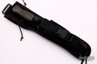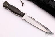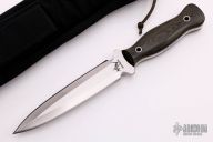 Maker statement: "The Shiva is a beautiful, bilaterally symmetrical double edged dagger. Ostensibly designed for the same mission parameters as the legendary Fairbairn -Sykes Commando Knife, it has a number of significant design improvements which broaden its functional scope considerably. Most notable perhaps, is the handle, which flares out from a gentle lemon-drop to a knob-like pommel, which greatly facilitates a firm grip, and almost eliminates the problem of rolling in the palm. The geometry of the double hollow ground edges make them both striking in appearance and singularly functional. The Shiva gives you the best attributes of a stabbing pike and a straight razor." Black canvas micarta handle with hollow steel pins. Blade is .243" thick and 1.222" deep with full tang construction. Has a hand rub satin finished double-edged blade. Comes with black nylon sheath. Excellent condition.
