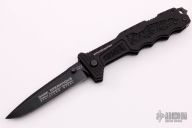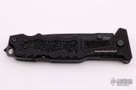 This Dark Operations Stratofighter lockback has a black cobalt tungsten vanadium stainless steel drop point partially serrated blade with dual thumb studs and notched thumb rest. Handle is black T6160 aircraft aluminum with non-slip inserts, black stainless steel spacer, reversible tip up black stainless steel clip, and glass breaker with integral lanyard hole. Has a couple dings, otherwise excellent condition. Comes with a zippered case.