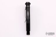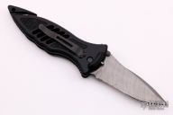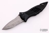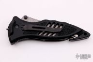 This CQD Mark 1 M/A Folder from Masters of Defense has a spear point Damascus blade with dual thumb studs and serrations. Handle is black aluminum with non-slip inserts, reversible titanium tip down clip, seat belt cutter, lanyard hole and glass breaker. Excellent condition. Comes with original box, sheath and papers. #110/150