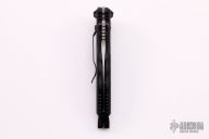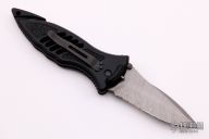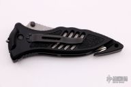 This CQD Mark 1 M/A Folder from Masters of Defense has a spear point Damascus blade with dual thumb studs and serrations. Handle is black aluminum with non-slip inserts, reversible titanium tip down clip, seat belt cutter, lanyard hole and glass breaker. Excellent condition. Comes with original box, sheath and papers. #105/150