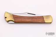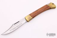 This Vintage German-made lockback by Puma has brass bolsters with integral liners, wood scales. Blade is satin finish. Comes with original box and papers. Has a little patina, otherwise excellent condition.