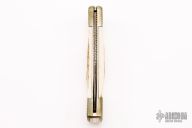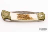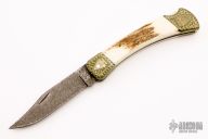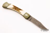 This Model 110 Buck has been given a custom handle by David Yellowhorse. Features a "Native Steel" blade with nail nick. The handle has textures nickel silver bolsters with integral liners, stag scales, stainless steel springs. Comes with original box and COA. Has some patina, otherwise excellent condition.