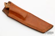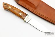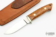 This drop point hunter from A.G. Russel features a drop point satin finished blade, .149" blade stock and 1.004" blade depth, full tapered tang construction. The handle features a nickel silver guard with burl wood scales and black liners. Comes with a brown leather sheath. The guard has some patina, otherwise excellent condition.