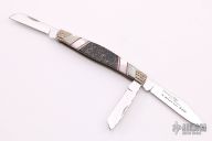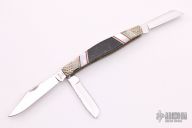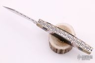 This Buck knife Customized by Painted Pony is a slipjoint with carved nickel silver bolsters and butt, gold web onyx covers with black lip pearl, nickel silver, mother-of-pearl and red spacers. 3 Mirror polished blades with fileworked spines. Includes original box and papers. Excellent condition. #78 of 250