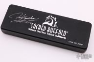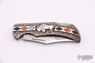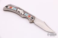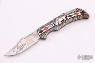 This "Sacred Buffalo" folder is a David Yellowhorse Premier Edition by United Cutlery. It features a satin finished clip point blade with swedge and nail nick. The blade is marked with his signature and logo. The handle is comprised of carved sterling silver with turquoise, black jet and orange piny oyster stone inlays over a steel lock back. Numbered 0030/2500. Includes original box and COA. Excellent condition.