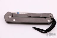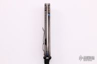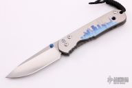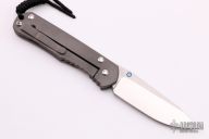 This large Sebenza by Chris Reeve features a satin blade with tumble finish flats and single anodized thumb stud. "Unique Graphic" milled titanium frame with bead blasted edges and lockside, matching tip up clip. Includes leather pouch, original box and paperwork dated March 2, 2006. Nice detent lockup and blade seating. Excellent Condition.