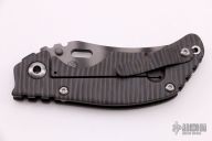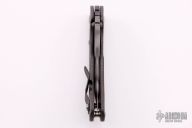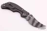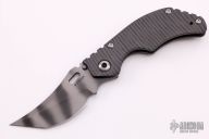 This KRT by Mick Strider features a tiger stripe upswept blade with thumbhole and notched thumbrest. The handle has a flame finished titanium frame with a matching titanium tip up clip. Nice detent, lockup and blade seating. New from Maker.