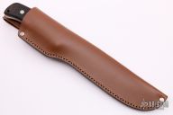This 8" Big Boar Tusker by Scott Gossman features a satin finished clip point blade with a full tang construction, .242" Blade Stock and 1.747" Blade Depth. The handle is composed of tan/black canvas micarta scales with orange liners. Includes leather sheath with belt loop. Excellent condition.