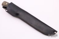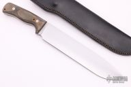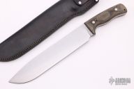 This 10" Big Boar Tusker by Scott Gossman features a satin finished drop point blade with a full tang construction, .255" Blade Stock and 2.045" Blade Depth. The handle is composed of tan/green canvas micarta scales. Includes leather sheath with belt loop. Excellent condition.
