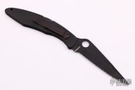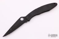 This Police Lockback by Spyderco has a black finished clip point blade with full serrations and thumb hole. Handle is black finished stainless steel with stainless steel back spacer (lock), and black stainless steel tip down clip. Comes with original box.  There are several scuffs on the blade and handle otherwise the knife is in excellent condition.
