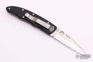 This Howard Viele designed Spyderco features a Aus-8 fully serrated blade. Polished black linen micarta scales with stainless liners. Stainless steel tip down clip. Includes the original box and papers. Excellent Condition.