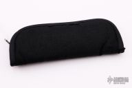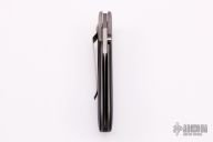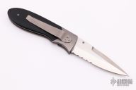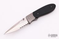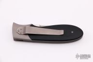 This liner-locking folder features a spear point blade with a false top edge, serrations and single thumb-stud. The handle has titanium bolsters, black G-10 scales, titanium liners and pocket clip, tip down carry, and a black G-10 back-spacer. Comes with a nylon zippered case. "CC 061" on blade and "CHAFFEE 97" on the underside. Includes a padded zippered case. Excellent condition.