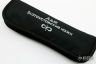 This knife by A&R features a stainless Damascus blade with fullers, .094" blade stock and .839" blade depth, hidden tang construction. The handle has a notched stainless steel guard and birch wood grip. Comes with a black leather sheath and a zippered case. Excellent condition.