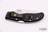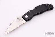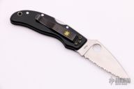 This Spyderco Calypso Jr. is a discontinued model with a satin finished blade with a fully serrated edge and black micarta handle. Includes original box. Has a few light scratches, otherwise excellent Comes with original box.