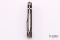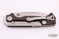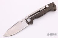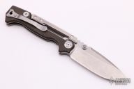 This MG-AD-15 from Andrew Demko features a drop point stonewash finished machine ground blade with swedge, dual thumb studs and notched thumbrest. The handle is comprised of textured black canvas micarta scales, tumbled titanium frame with reversible titanium tip up clip and tumbled titanium backspacer. This knife features a unique "Top Lock" style locking mechanism. Comes with original box. Excellent condition.