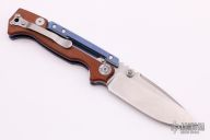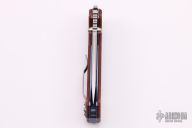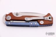 This MG-AD-15 from Andrew Demko features a drop point stonewashed machine ground blade with swedge, dual thumb studs and notched thumbrest. The handle is comprised of textured natural linen micarta scales, anodized titanium frame with reversible titanium tip up clip and anodized titanium backspacer. This knife features a unique "Top Lock" style locking mechanism. Comes with original box. Excellent condition.