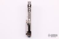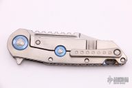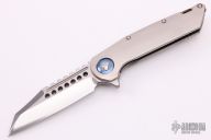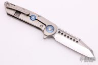 This Warhound from Marfione Custom Knives features a mirror polished blade with satin flats, and a notched thumbrest. The handle has a satin finished titanium frame, anodized titanium pivot collars, flamed titanium backspacer, satin finished hardware. Nice detent, lockup and blade seating. "A. Marfione" and S. Marfione inside the frame and dated 11/2017. S/N #003. Includes the original box and papers. Excellent Condition.