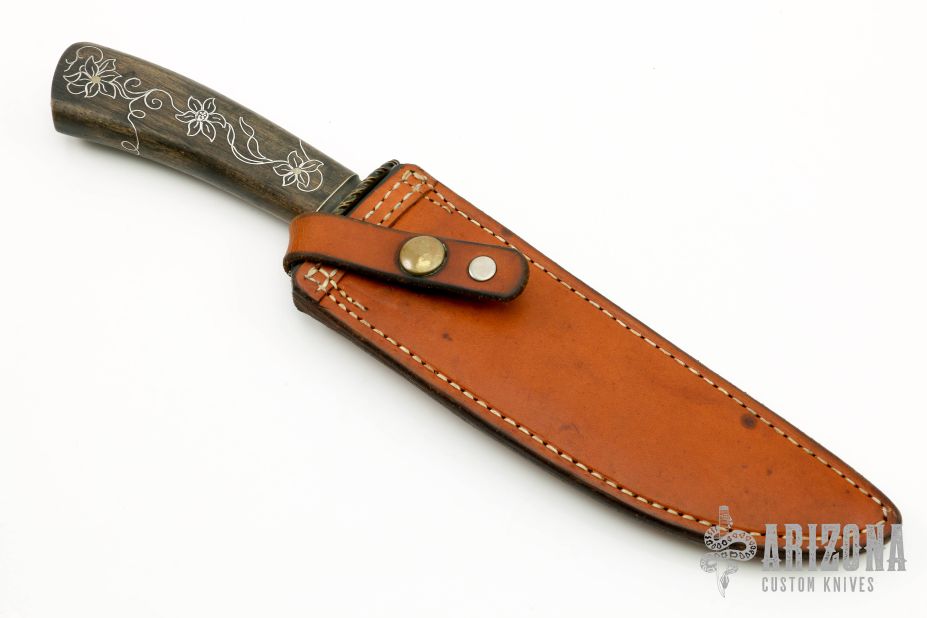 This Bowie by Master Smith Jerry Fisk features a Damascus blade (192 layers of 01 and 1020 Steels), .211" blade stock and 1.376" blade depth, hidden tang construction. The handle has a fileworked nickel silver guard and fluted collar, dyed persimmon wood grip with fine silver wire inlays. Comes with a brown leather sheath made by Rowe's Leather. Comes with a letter from Jerry Fisk dated 3/16/93. Excellent condition.