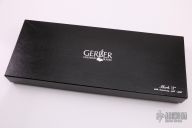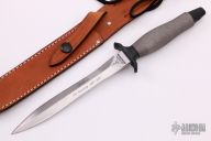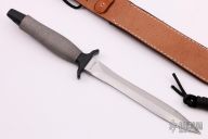 This 20th Anniversary Mark II #XX0608 has a satin finished stainless steel double-edged blade with hidden tang. Blade stock is .238", depth is .893". Handle is Grey "Cat's Tongue" textured aluminum with black double guard and black butt cap - with lanyard hole. Comes with original black leather sheath, box, papers. This model has a 5 degree canter on the blade so it rides closer to the body during carry. This knife was sealed in the box and completely unopened when we got it, I opened the box and it has some light oxidation on the blade, otherwise excellent condition.