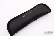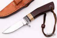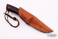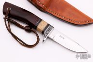 This Hunter by Rich Hale features a mirror polished clip point blade with a hidden tang construction. .147" Blade Depth. .838" Blade Depth. The handle features an engraved nickel silver guard, snakewood grip, ebony wood/nickel silver/black/oosic spacers, lanyard hole at the butt. Includes a brown leather sheath. Has some small cracks in the snakewood, otherwise good condition. Comes with a zippered case.