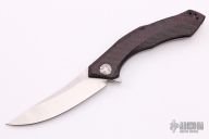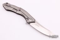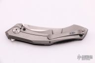 This 0462 Sinkevich Design flipper by Zero Tolerance features a satin finished upswept blade with flipper and swedge. The handle has a red/black carbon fiber and tumbled titanium frame, black aluminum backspacer and a tip up reversible titanium clip. Nice detent, lockup and blade seating, rides on bearings. Has stainless steel lockface insert and overtravel stop, ceramic detent ball. Comes with original box and papers. S/N 5933. Excellent condition.