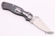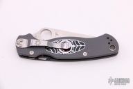 This Paramilitary 2 Linerlock Folder has a satin finished clip point blade with thumb hole and notched thumbrest. Handle has grey G-10 scales with stainless steel liners and stainless steel 4-way reversible clip. Excellent condition. Comes with original box and papers. The 2018 Forum Knife! This limited-edition version of the iconic ParaMilitary™ 2 includes an oval Spyderco inlay in each side of the handle. Precisely fitted into the textured gray G-10 scales, the inlays feature a polished silver web encircling a bright red Spyderco “bug” logo