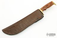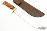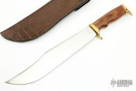 This Combat Bowie by Zakharov Knives features a satin polished blade with .098" blade stock and 2.075" blade depth, hidden tang construction. The handle has a brass guard and butt with wood grip. Comes with a leather and kydex sheath with belt loop and a zippered case. Excellent condition.