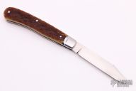 This Jig Bone Slip Joint by TA Davison features a hand rub satin finished clip point blade with a long pull nail nick. The handle has fluted stainless steel bolsters, jigged bone covers with stainless steel escutcheon, stainless steel liners, stainless steel spring. Comes with zippered case. Has half-stop, flush in all positions. Excellent condition.