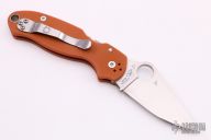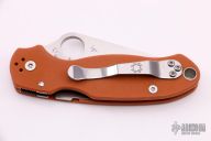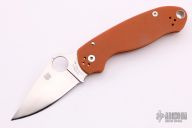 This Para 3 by Spyderco features a satin finished clip point blade with thumb hole and notched thumbrest. CPM REX 45 Blade Steel. The handle is comprised of an orange G-10 frame over nested steel liner and stand-offs. The steel pocket clip is 4 way adjustable. Includes original box and paperwork. Excellent condition.
