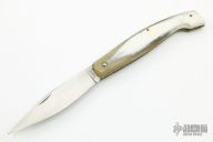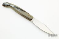 This Pattada by Figus features a satin finished blade with nail nick. The handle has honey horn covers with a stainless steel spring. Has some light scratches, otherwise excellent condition. Comes with a zippered case.