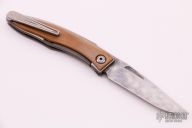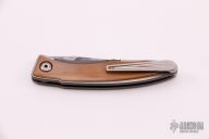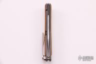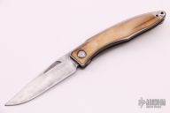 This Mnandi by Chris Reeve Knives features a Rain Drop Damascus clip point blade with thumb grooves and notched thumbrest. The handle is comprised of a two-tone titanium frame with mammoth ivory overlay. Machined titanium tip up clip. Has been used and carried, has scuffs and scratches, has been resharpened, otherwise good user condition.