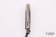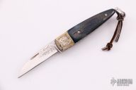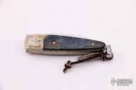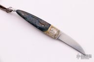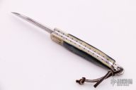 This slipjoint by GH Knives (Gilles Hebert) features a hand rub satin finished blade with nail nick and engraving. The handle has engraved nickel silver bolsters with 24kt gold inlays, beautiful mammoth ivory covers, lanyard bail, fileworked and satin finished titanium liners, 440C spring. Has half stop, flush in all positions. Comes with wooden box and COA. New from maker.