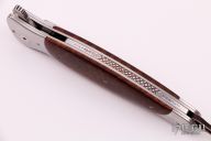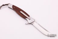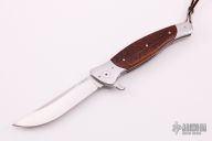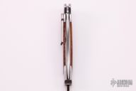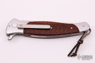 This knife by GH Knives features a hand rub satin finished blade with swedge and notched flipper. The handle has satin finished 304 stainless steel bolsters, beautiful snake wood scales, satin finished titanium liners, engraved stainless steel backspacer, tip down titanium clip. Nice detent, lockup and blade seating. Comes with wooden box and COA. New from maker.