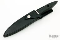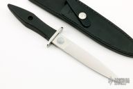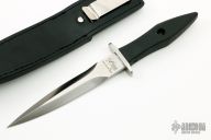 This Blackmoor Dirk by Blackjack knives features a satin finish double-edged 7Cr17 blade, 3/16" blade stock, 1" blade depth. Hidden tang construction with Kraton handle. This is one of the newer blackjack knives with the ace of spades logo. Comes with a black leather sheath (not original but fits nicely). Has some play in the guard, otherwise excellent condition.