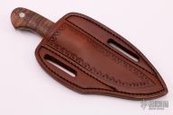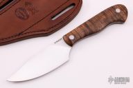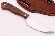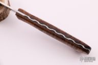 This Model 4 by James Scroggs features a satin finished blade, full tang construction, .092" blade stock and 1.496" blade depth. Scales are Bastonge walnut wood with stainless steel pins. The tang is fileworked and filled with black epoxy with brass filings. Comes with a brown leather sheath by Michael O'Machearley. New from maker.