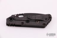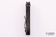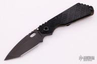 This Mick Strider SNG framelock folder features a black tanto blade with thumbhole and notched thumbrest. The handle has a black G-10 and flamed titanium frame with titanium clip, tip up carry. Jimping on blade spine. The G-10 has a cross-hatch pattern. Nice lockup, detent, and blade seating. New from maker at the 2020 LVCKS. This knife is one of 20 made for the 2020 LVCKS.
