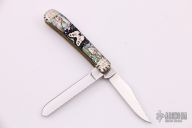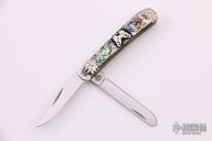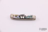 This two blade trapper features two mirror polished blades both with single nail nicks. The handle features nickel silver bolsters, abalone covers and two butterfly inlays. Includes the original box and papers. Excellent Condition.