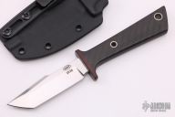 This Traverse Tanto by Shane Sibert features a hand rub satin finished tanto blade, .126" blade stock and .944" blade depth, hidden tang construction. The handle has a carbon fiber grip with red G-10 spacer. Comes with kydex sheath, zippered case and COA dated 10/2020. New from maker at the 2020 CCKS.