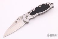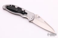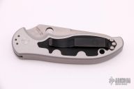 This C121P Embassy from Spyderco features a clip point style blade with swedge, small thumb hole and notched thumb ramp. The handle is comprised of an aluminum frame with black G10 inlays. Lanyard hole in pommel. Reversible black coated stainless steel tip up clip. Blade is deployed via push button with fast coil spring action. Sliding safety on "A" side of handle. Comes with original box and papers. Excellent condition.