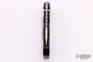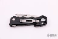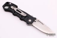 This folding knife features a satin finish blade. Black aluminum frame with a letter opener and a machined hex slot for light duty use of a 1/2" nut. Includes original box and paper work. Has a couple small rust spots on the blade, otherwise excellent condition.