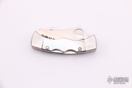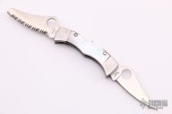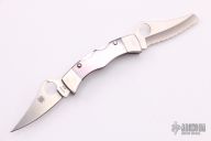 This Micro Dyad by Spyderco features two satin finished blades, one is fully serrated and both have thumbholes. The handle has black lip pearl scales, stainless steel liners and bolsters. Excellent condition.