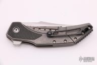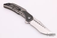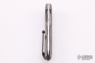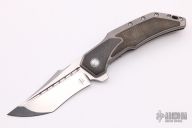 This Astio by Todd Begg features a stonewash finished tanto recurve blade with fullers and satin flats. The handle has a tumbled titanium frame with carbon fiber and green canvas micarta  inlays, jewel iced DLC coated titanium backspacer and tip up clip with ceramic ball, jewel iced titanium pivot collars. Rides on ceramic IKBS, nice detent, lockup and blade seating. Excellent Condition.
