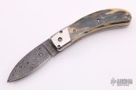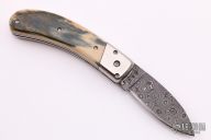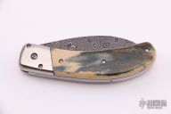 This Scale Release Auto by Ty Montell features a Damascus drop point blade . The handle features titanium bolsters, mammoth ivory scales with blue liners, titanium liners, stainless steel backspacer. Comes with a zippered case. Excellent Condition.