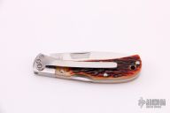 This is an original Spyderco Jess Horn C27P lockback with plain edge and ambidextrous nail nicks. The handle has stainless steel bolster, jigged bone scales, stainless steel liners and backspacer, tip down stainless steel clip. Nice lockup and blade seating. Includes padded and zippered case. Has a few light scratches, otherwise excellent condition.