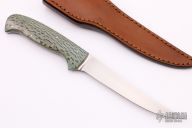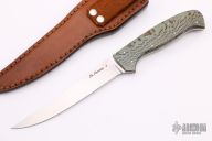 This Fillet Knife from Mike Mooney features a hand rub satin finished blade with .108" Blade Stock and .912" Blade Depth, full tang construction. The handle has stabilized and dyed Australian lacewood scales. Includes a brown leather sheath, COA and a padded zippered case. Excellent condition.