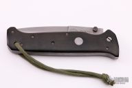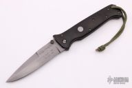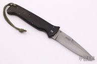 This SOF 92 D/A Auto linerlock by Butch Vallotton features a bead blast blade with false top edge and a single checkered thumbstud. The handle has black linen micarta scales, bead blasted stainless steel liners and backspacer. Powerful and fast leaf-spring opening. Smooth manual action. The front of the blade is marked "SOF 92" and numbered 30of 30. Butch and Rainy's stamps are on the front and Shawn's is on the back. Comes with COA dated Sept 18, 1992. Has some scuffs/scratches, otherwise excellent condition.