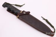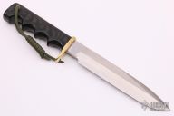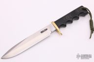 This Model 16 Diver by Randall Made Knives features a satin finished blade with sharpened top edge and notched thumbrest, .223" blade stock and 1.223" blade depth, full tang construction. The handle has a brass guard, black linen micarta finger grip handle. Comes with a waxed brown leather sheath. Excellent condition.