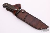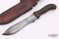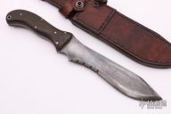 This Field Knife by Marsh Custom Knives features a gun blued recurve blade with partially serrated edge, .172" blade stock and 1.672" blade depth, full tang construction with green canvas micarta scales and brass pins. Comes with a brown leather sheath. Has some scratches, otherwise good condition.