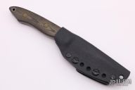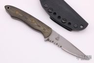 This knife by Greg Lightfoot features a bead blasted spear point blade with partial serrations and notched thumbrest, .158" blade stock and .902" blade depth, full tang construction. The handle has green linen micarta scales with brass pins, lanyard hole at the butt. Comes with a kydex sheath Has some scratches and scuffs, otherwise good condition.